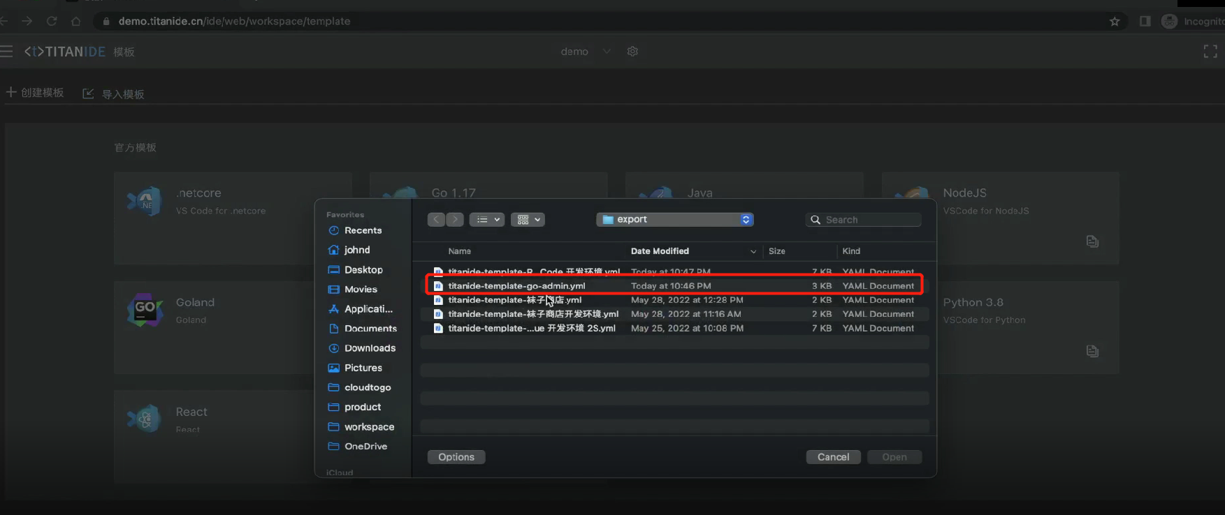 将事先配置好的 Go Admin 开发环境模板导入到我的工作空间