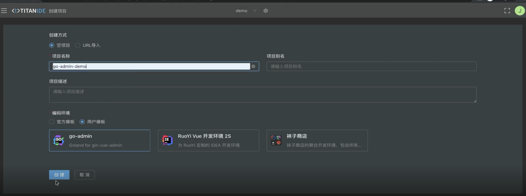 直接点击刚导入的 Go Admin 开发环境模板,输入您的项目名称,一键创建 Go Admin 开发环境。