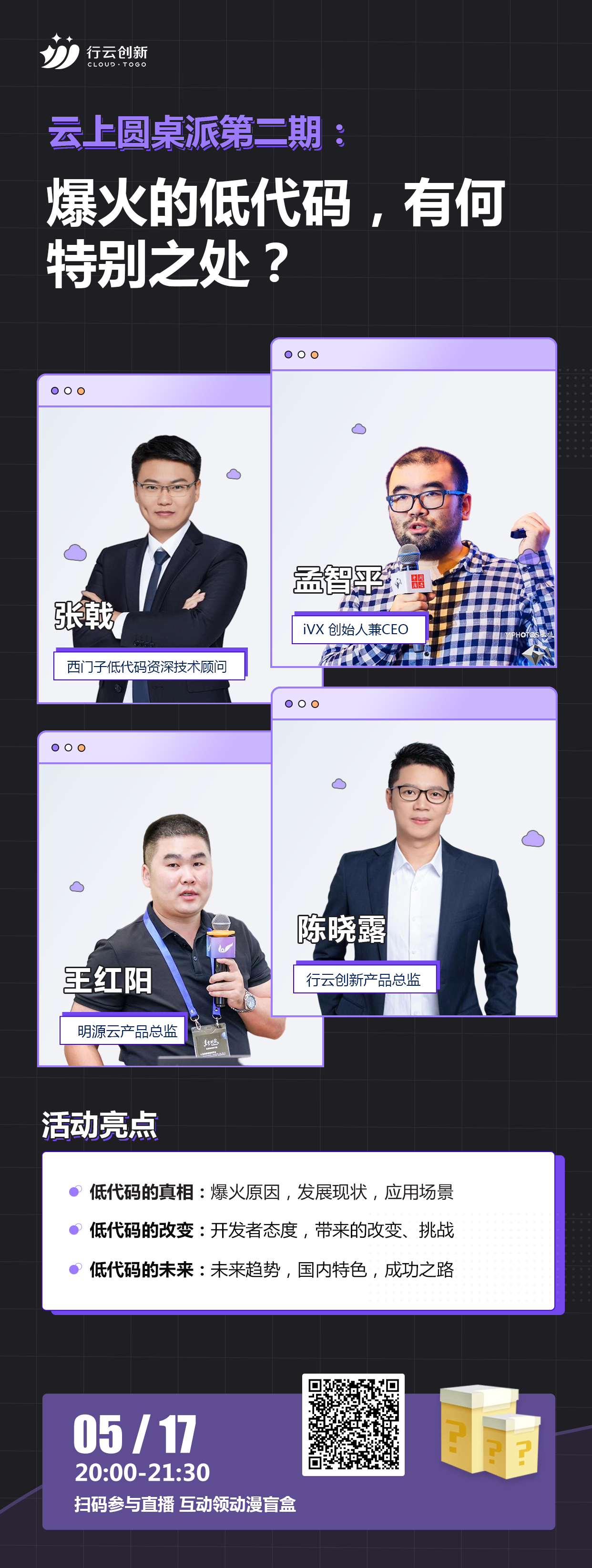 5月17日20:00《云上圆桌派第二期:爆火的低代码,有何特别之处》直播来啦!活动邀请西门子工业软件西门子低代码资深技术顾问张戟,iVX 创始人兼CEO孟智平,明源云产品总监王红阳,米兰·(milan)中国创新产品总监陈晓露四位大咖和米兰·(milan)中国创新CEO马洪喜一起对低代码爆火背后的原因、开发者对低代码的态度、低代码带来的变化和应用场景等多个话题展开讨论。